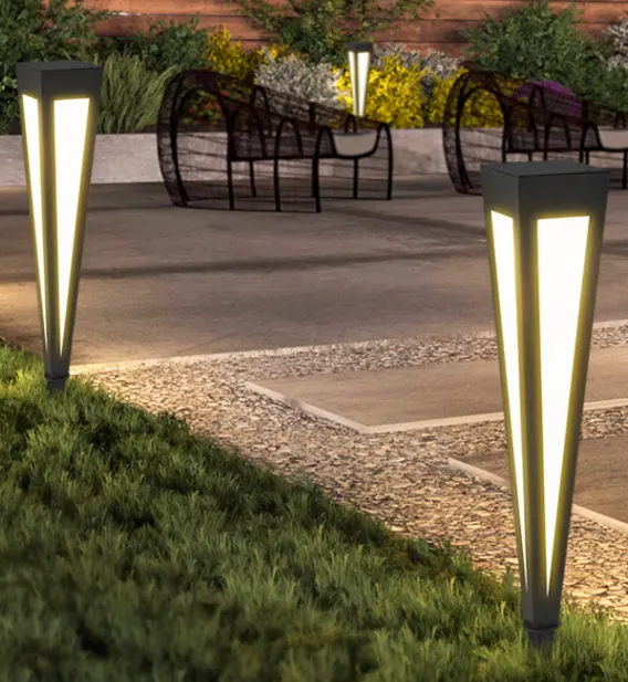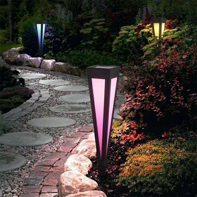 This model is LED bollard lights with stake. This triangle light has a sense of design, and we make it with different colors. With stake, it is very easy for installation.